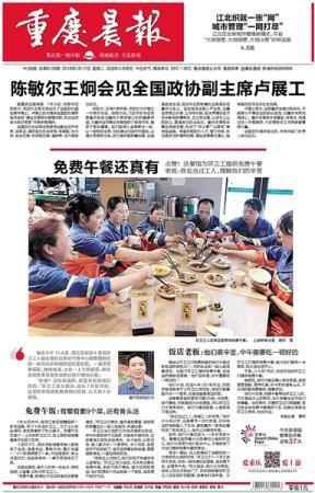 此前,重庆晨报报道了饭店老板饶灯兴长期免费请环卫工人吃饭的善举。他的善心举动经过视频传播,一天内获得了市民大量点赞。同时也经过上游新闻、重庆晨报的推荐,获得了由重庆晨报联合阿里巴巴天天正能量公益平台发起的“天天正能量”第250期评选的三等奖。