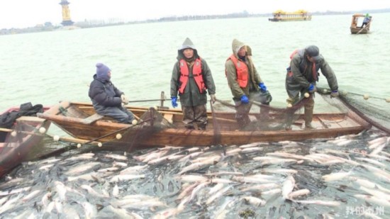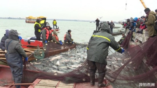 溱湖水面共有6000亩,那么这么大的水面,如何才能有效进行捕鱼呢?为了这次冬捕能够有更大收获,溱湖景区从山东邀请了专业的“赶鱼”队伍,在正式捕捞之前,他们进行赶鱼,从一个方向将鱼驱赶到一个特定的区域,进行集中捕捞。