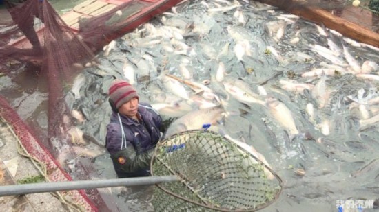 经过上午近三个小时的捕捞,共捕获鲢鱼、花鱼等共计三万余斤。刚捕捞的鱼被送到岸边,每条鱼大约在10斤左右,游客可以以每斤十块钱价格购买。