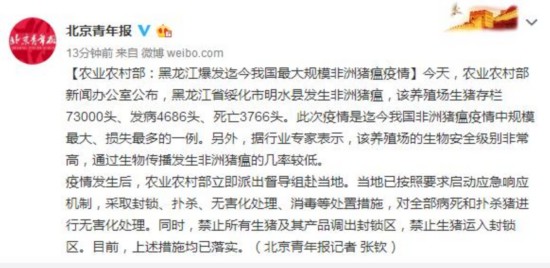 【农业农村部:黑龙江爆发迄今我国最大规模非洲猪瘟疫情】今天,农业农村部新闻办公室公布,黑龙江省绥化市明水县发生非洲猪瘟,该养殖场生猪存栏73000头、发病4686头、死亡3766头。此次疫情是迄今我国非洲猪瘟疫情中规模最大、损失最多的一例。另外,据行业专家表示,该养殖场的生物安全级别非常高,通过生物传播发生非洲猪瘟的几率较低。