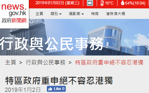 香港特别行政区政府新闻网1月2日发表声明称,为落实本届政府施政理念,行政署2017年12月28日重开政府总部大楼东翼前场地,虽然容许市民进入场地进行公众集会、示威或发表意见,但不容许个别人士利用该处鼓吹或宣扬“港独”。