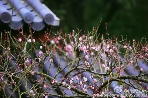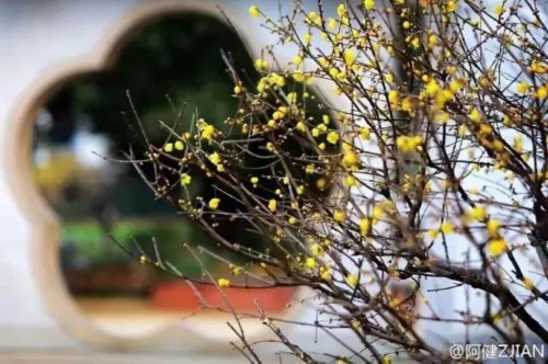 相比热闹的梅花,腊梅更清新、朴素、典雅!娇黄的花蕾衬着古色古香的亭台楼阁,别有一番古意。