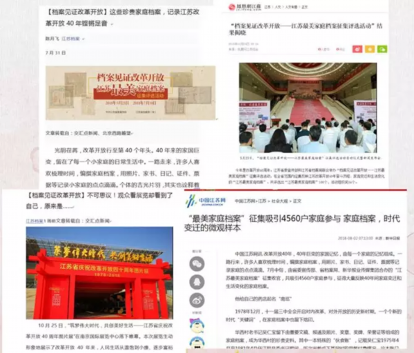 档案见证改革开放。2018年是改革开放40周年,按照中央、省委关于庆祝改革开放40周年部署要求,坚持以人民为中心的思想,江苏省档案局联合省委宣传部、新华报业传媒集团联合举办“江苏最美家庭档案”征集评选活动。通过评选活动展示江苏改革开放40年的伟大历程和巨大成就,展示新时代全面深化改革、共创美好生活的生动实践,讲好人民群众在改革开放中的奋斗故事,讲好江苏改革开放的故事,讲好新时代中国特色社会主义的故事,点赞美好江苏!