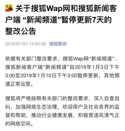 同一天,“搜狐新闻”在其客户端发布《关于搜狐Wap网和搜狐新闻客户端 “新闻频道”暂停更新7天的整改公告》称,依据有关部门整改要求,搜狐Wap网“新闻频道”、搜狐新闻客户端“新闻频道”自2019年1月3日下午3:00至2019年1月10日下午3:00暂停更新,其他频道正常运营。搜狐将严格按照有关部门的整改要求,深入自查自纠,加强网络生态治理,欢迎用户及社会各界的监督和帮助,推动行业健康发展,积极营造风清气正的网络空间。