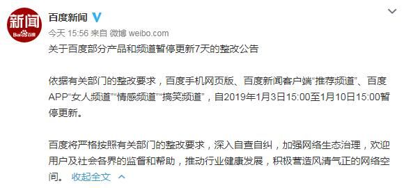 1月3日,“百度新闻”官方微博发布《关于百度部分产品和频道暂停更新7天的整改公告》称,依据有关部门的整改要求,百度手机网页版、百度新闻客户端“推荐频道”、百度APP“女人频道”“情感频道”“搞笑频道”,自2019年1月3日15:00至1月10日15:00暂停更新。百度将严格按照有关部门的整改要求,深入自查自纠,加强网络生态治理,欢迎用户及社会各界的监督和帮助,推动行业健康发展,积极营造风清气正的网络空间。