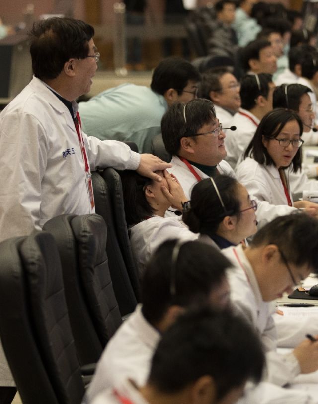 1月3日,在北京航天飞行控制中心,科研人员庆祝降落成功。新华社记者 金立旺 摄
