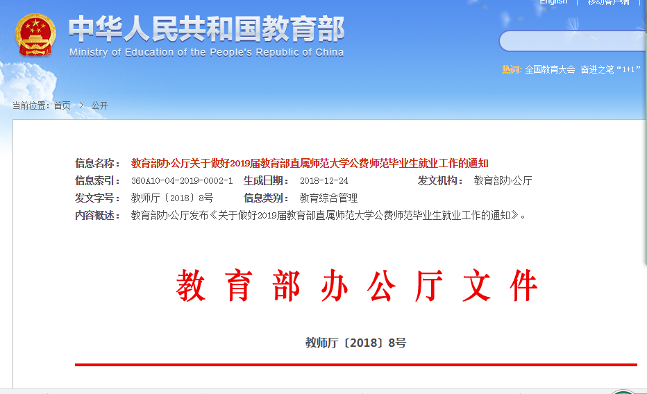 教育部办公厅关于做好2019届教育部直属师范大学公费师范毕业生就业工作的通知