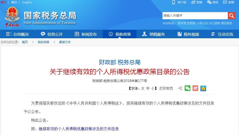 “国家税务总局”官网1月3日发布《财政部 税务总局关于继续有效的个人所得税优惠政策目录的公告》