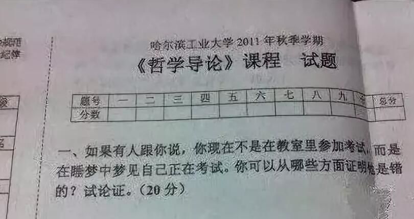 哈尔滨工业大学就更绝了,试卷第一题就让考生论证:如果有人跟你说,你现在不是在教室里参加考试,而是在睡梦中梦见自己正在考试。你可以从哪些方面证明她是错的?