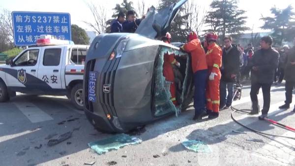 中队立即出动两辆消防车与10名指战员前往处置。中队抵达现场发现,现场为一辆宝马车与本田车发生碰撞,导致本田侧翻,本田车后排座一小孩与两大人被困。