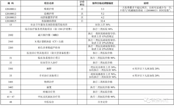 3、临床诊疗类:临床各系统诊疗(31类),执行县级医院90%;经血管介入治疗(32类),执行县级医院价格;麻醉(3301类)按一类医院原价上浮20%,各类加收执行县级医院90%;手术治疗其他项目(33类)按一类医院原价上浮50%,各类加收执行县级医院90% ;疼痛诊疗类(36类)执行县级医院价格。六岁(含)以下儿童手术项目加收20%。
