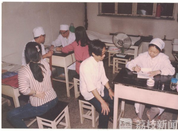 照片拍摄于1982年,那时25岁的她刚被学校分配到南京市中医院的外科,照片里一间诊室,一台风扇,几张旧桌椅,三位医生同时坐诊:“你看到我们用的那个书写病历的笔都是蘸水钢笔,那个年代原子笔都是很少见的。我们的治疗手段都是以中医为主,望、闻、问、切,对一些蛇毒咬伤啊,感染,皮肤病,我们都是用中药吃、搽、洗、敷,中医的特色还是很明显的。”