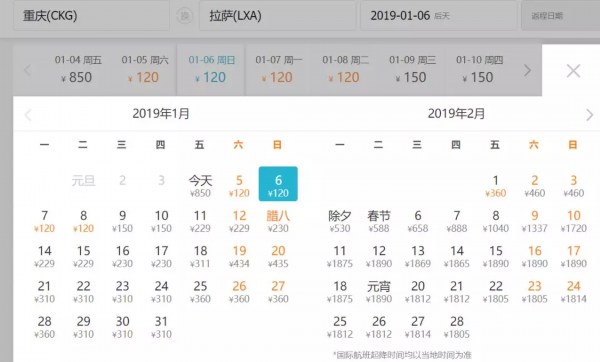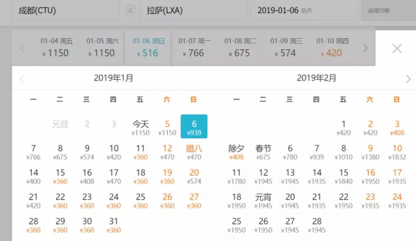 除了火车票外,出藏飞机票也比较紧张。1日,记者登录携程、飞猪等互联网购买飞机票的软件发现,2019年春节前,拉萨至成都、重庆、郑州、上海等方向的飞机票几乎都是全价机票,如果旅客不提前预订,有时候还买不到当日所需的飞机票。不过,进藏飞机票还是比较宽松的,在春节前,成都、重庆至拉萨方向,飞机票低至1折至2折的折扣价,一张成都至拉萨的飞机票只需要300多元。