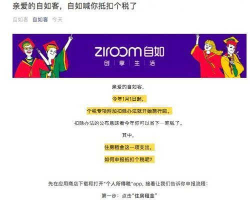 1月5日,自如公司在微信公众号“自如客”明确,租客在通过个人所得税App申报房屋租金专项附加扣除时,选择出租方类型时可选择“组织”,并填入相应的“单位统一社会信用代码”。