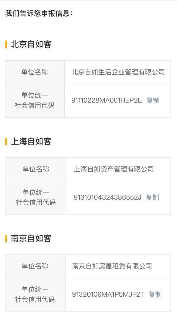 自如在其官方App上还发布了“个税抵扣申报所需自如信息公示”,提供了北京、上海、南京、深圳、杭州、成都、天津、武汉、广州等分公司的单位统一社会信用代码。
