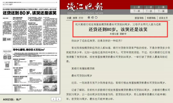 有过购房按揭贷款经历的人都知道,银行对贷款年限有严格的规定,不是你想贷多少年就能贷多少年。比如一些临近退休的中老年人,可贷年限就很短。不过,据《钱江晚报》报道,杭州某银行近日悄悄调整了房贷政策,规定房屋按揭贷款最长可贷到80周岁,一举打破了贷款人最高年龄纪录。