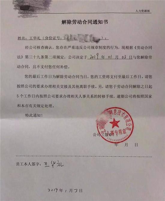 1月3日,深圳虐童案举报者王华礼收到公司解聘书,其公司因王华礼违反了《劳动合同法》第39条第2款规定,以“严重违反用人单位的规章制度”为由解聘他,并且不会支付任何补偿。今日,王华礼代理律师周兆成认为,该公司以“严重违反单位规章制度”为解除与王华礼的劳动合同是错误的,下一步,律师将代表王华礼与用人单位进行沟通,也不排除是以违法解除劳动关系为由申请劳动仲裁或提起诉讼。