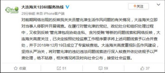 消息指出,在履行对管兆津的党纪、政纪处分和组织处理过程中,又收到反映“管兆津包庇协助走私、贪污受贿”等新的问题线索和网络反映,大连海关高度关注,已决定按照纪检监察工作程序要求将上述问题线索予以合并查处,并于2018年12月19日成立了专案核查组。