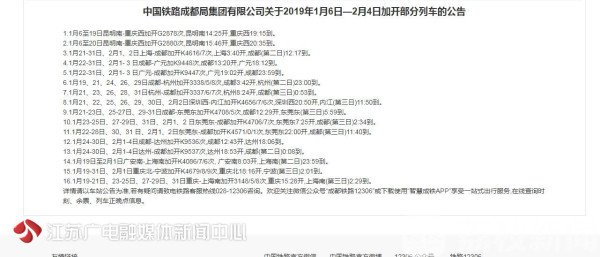 中国铁路总公司数据显示,2019年春运期间,全国铁路预计发送旅客41330万人次,将再创历年春运新高。火热的抢票大战中,大家如果实在买不到回家的直达火车票,铁路部门也建议尝试迂回订票的方式,中转回家。比如,旅客可先坐到中途比较大的中转站,再从这些中转站适当绕路回家。而如果希望购买的长途列车全程无票,但中间短途站点有票,旅客也可尝试先买一段有票的短途票,上车后直接补后半段票。春运期间铁路部门将根据客流情况增开列车,具体信息,可查询12306网站,目前成都铁路局已计划从今天开始到2月4日期间,加开数班列车运送旅客。