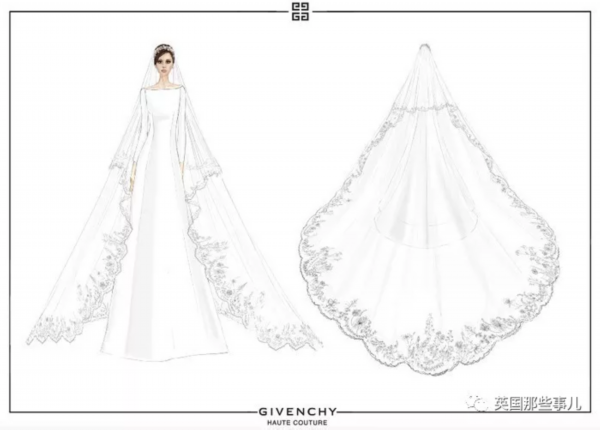 婚纱礼服由丝绸和重磅真丝欧根纱制成,头纱长约5米,