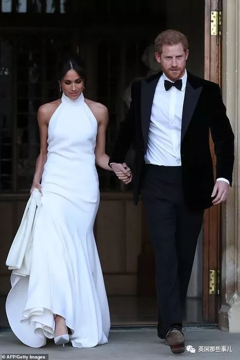 随后的婚礼招待会上,梅根换上一件来自英国设计师Stella McCartney的白色曳地礼服,