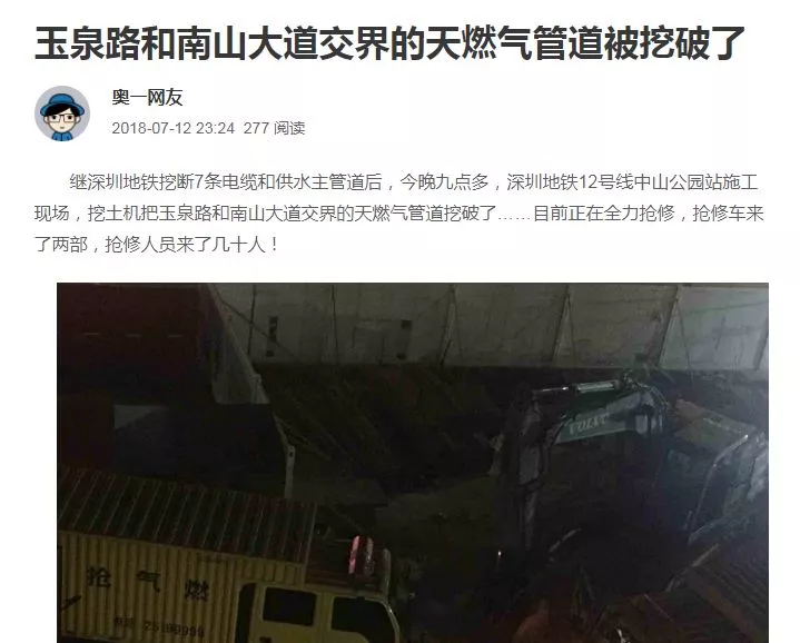 2018年7月12日23时,有网友报料称深圳地铁12号线中山公园站施工时将他们片区的燃气管道给挖破了,现场来了两辆抢修车和几十个抢修人员。