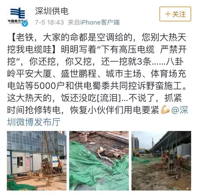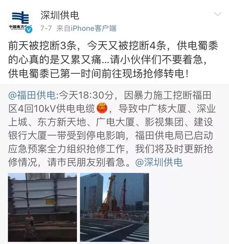 2018年7月5日、7月7日两天,深圳市供电局连续在官方微博上怒怼深圳地铁,指责对方野蛮施工,挖断7条电缆,导致多个片区停电,部分小区连停电2次,停电时间超4个小时,酒店爆满,影响超过5000户。