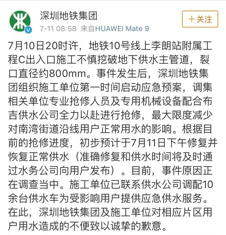深圳地铁也发布微博承认水管爆裂并再度致歉。