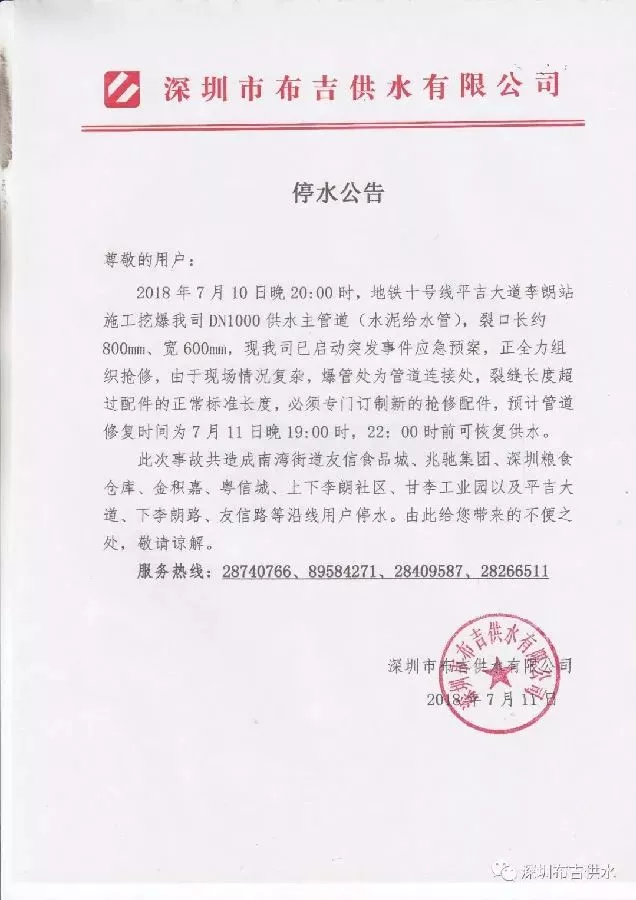 7月10日,深圳市布吉供水有限公司推送紧急停水通告称,地铁十号线平吉大道李朗站由于施工挖爆布吉供水有限公司DN1000供水主管道(水泥给水管 ),致使南湾街道友信食品城、兆驰集团、上下李朗社区等沿线用户停水。