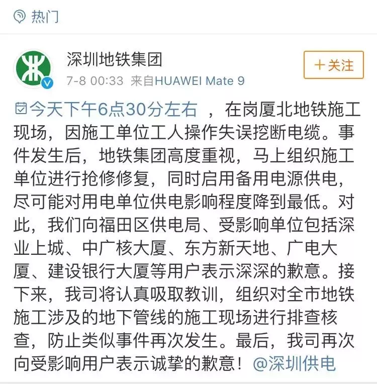 随后深圳地铁也连文致歉,承认暴力施工。并称在正式施工前,供电部门没接到施工方的报备。地铁施工方承认,这次确实是因为工程进度有点赶了,在施工过程中出现了失误才导致了这样的问题。