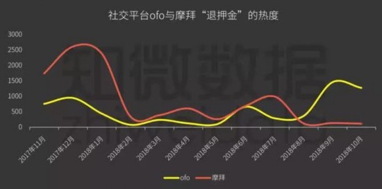 社交平台上关于“退押金”的提及量也证明了这一点。从提到“ofo+退押金”、“摩拜+退押金”的热度来看,早期网友对于退押金的争议都聚焦在摩拜上,直至2018年8月,ofo才反超了摩拜,押金问题日趋严峻。