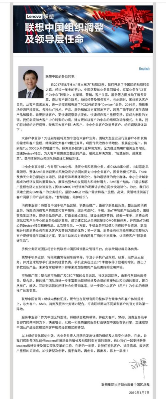 刘军表示,经过一年多的努力,联想中国区整体业务重回增长,在渠道、营销、客户关系、服务等诸多方面推动了变革。2019年,联想中国区必须加大客户中心转型的力度,建立更加以客户中心的组织和运作模式,联想对中国区进行组织构架调整,将聚焦三大客户群——大客户、中小企业客户和消费客户。