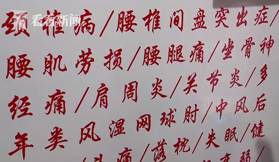 虽然店门口只贴有“推拿”、“火疗”的字样,然而在店内的墙上贴有的治疗项目可谓是琳琅满目,不仅能治疗腰肌劳损、坐骨神经痛,甚至各种疑难杂症都不在话下。