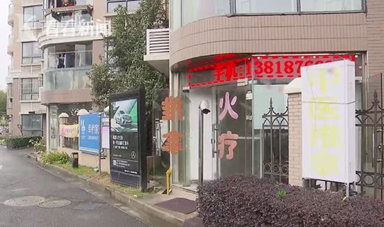 记者通过网上的信息,来到其中一家权健火疗馆。该店位于浦东新区周康路的一处小区内,记者还未进入小区门口,硕大的“火疗”字样就映入眼帘,滚动屏上还滚动着“中医秘方”、“火疗”等字样。随后记者进入店内,一名身穿白大褂的男子接待了记者。