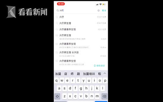 打开“大众点评”、“美团”等应用,搜索关键词“权健”,已无法显示相关内容。但若搜索关键词“火疗”,一排“权健火疗馆”仍旧一一在列。