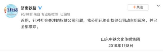 1月8日,中国铁路济南局集团有限公司官方微博@ 济南铁路 发文称,已终止权健公司动车组冠名,并已全部撤除。