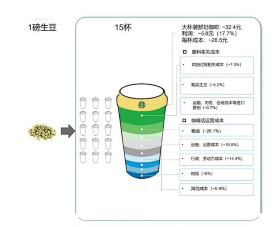 而另一方面,在每一杯咖啡成本上,租金、设备及运营和人力成本占了绝大多数(如下图)。也就是说,在外卖咖啡这个生意中,能够保证盈亏平衡的关键点,根本不是咖啡豆本身。