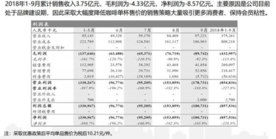 钛媒体收到的一份瑞幸咖啡专项融资计划书显示,按照其上一轮融资财务数据的净利润来看,2018年前9个月累计亏损8.57亿。