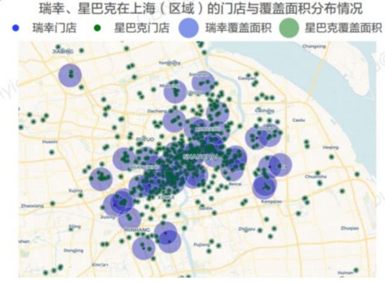 图中绿色代表星巴克,蓝色代表瑞幸咖啡(图片来源:CBNData)