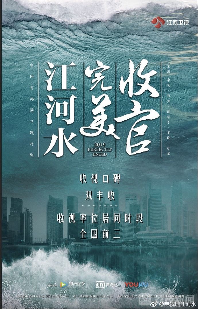 热播电视剧《江河水》昨晚(1月7日)在江苏卫视晚间幸福剧场,以及腾讯、爱奇艺、优酷三大视频网站的首轮播映圆满收官。该剧自12月14日在江苏卫视幸福剧场播出以来,不仅CSM52城收视破1,同时段省级卫视收视领先,也获众多好评,实现了收视和口碑的双丰收。