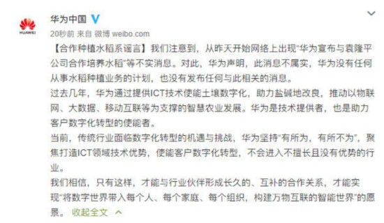 腾讯科技讯 8日晚间,针对网络上出现“华为宣布与袁隆平公司合作培养水稻”等消息。华为在微博上发布声明称,此消息为谣言,华为没有任何从事水稻种植业务的计划,也没有发布任何与此相关的消息。