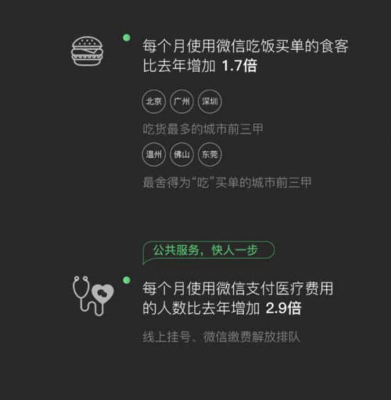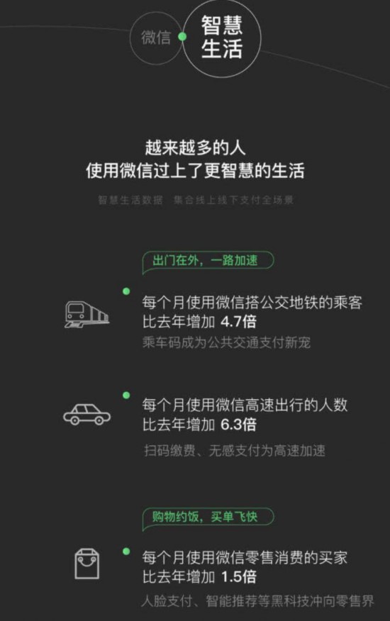 打造智慧生活方面,每个月使用微信搭公交地铁的乘客比2017年增加4.7倍,每个月使用微信零售消费的买家比2017年增加1.5倍。