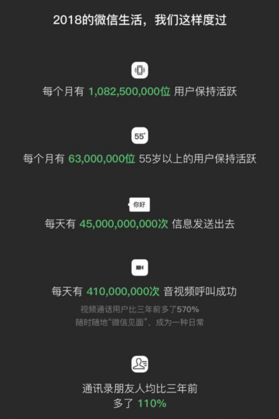 报告显示,2018年,微信每个月有10.82亿用户保持活跃,每天有450亿次信息发送出去,每天有4.1亿音视频呼叫成功。