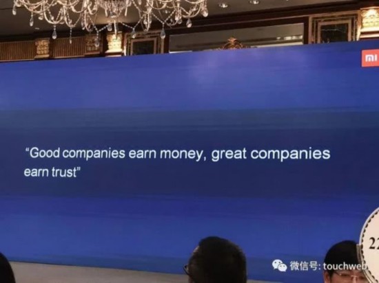 雷军在小米路演现场时就表示,小米的梦想是成为一家伟大的公司,好公司赚的是profit,伟大的公司赚的是人心,需要的是信任。