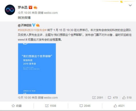 1月8日,子弹短信官方团队宣布,快如科技2019发布会将于1月15日19:30在北京举行,罗永浩将主讲本次发布会,主题为“我们想跟这个世界聊聊”。