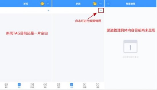 可能是由于尚未正式发布的原因,底部“新闻”TAG尚无内容,但点击右上角的“+”图标可以进行频道管理。