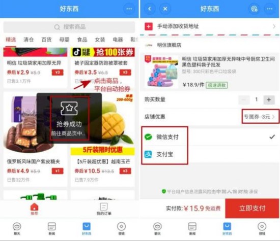 在优惠方式上,“好东西”目前主要采用平台自动抢劵并抵扣的模式。在支付手段上,“好东西”支持微信和支付宝支付。