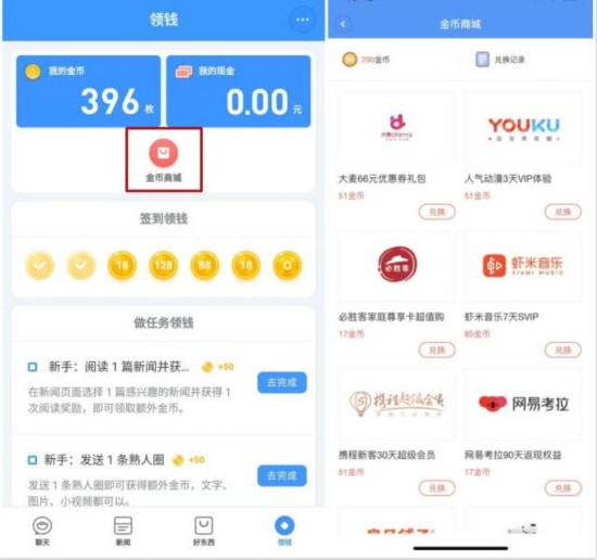“领钱”栏目与趣头条非常类似,用户可以通过签到、“阅读新闻”、“发送熟人圈”、“扫码支付”、“点赞、评论”、“与好友聊天”等方式领取金币。也就是说,聊天宝将趣头条的看资讯领金币的模式变为适应自身功能的读新闻+社交领金币,新增了聊天就能赚钱的玩法。