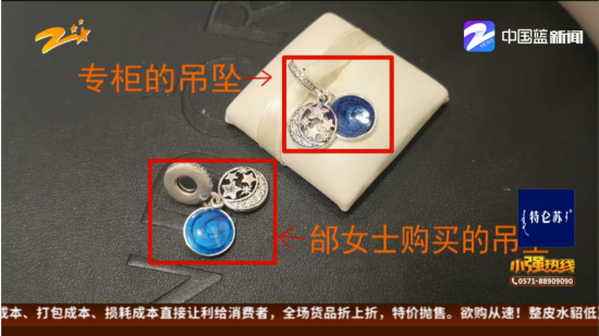 但是邰女士杭州嘉里中心的专柜买新产品,专柜工作人员的一番话,让她再也不想戴着这个吊坠了。柜员员看到邰女士手上的吊坠,就对着另外一位消费者说,你看这就不是我们家的!柜员就拿出同一款吊坠,一对比才发现,邰女士的吊坠和专柜的吊坠,有明显的色差,而且质地差了很多,虽然吊坠不是很贵,但是也不得不怀疑,自己买到了假货!