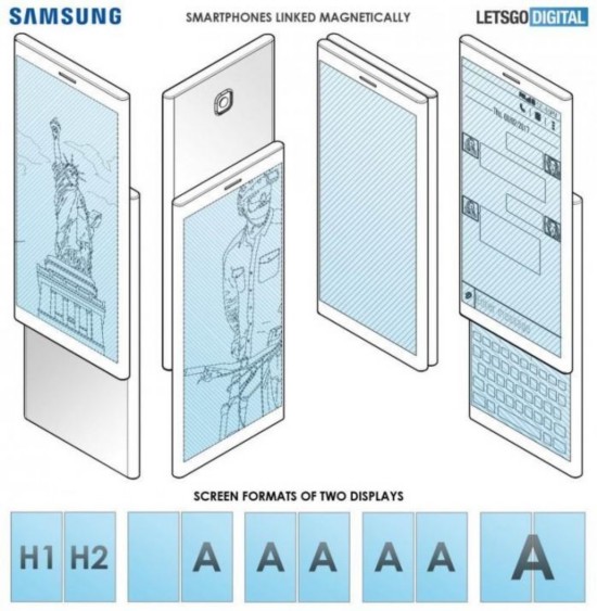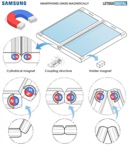去年11月三星展示了Galaxy F,在柔性OLED屏幕上用特制的透明薄膜来替代玻璃,从而实现最令人兴奋的可折叠效果。不过荷兰博客LetsGoDigital近期发现了一项三星于去年6月份提交、今年1月份获批的新专利,它通过两个磁性铰链将两个手机屏幕连接起来。